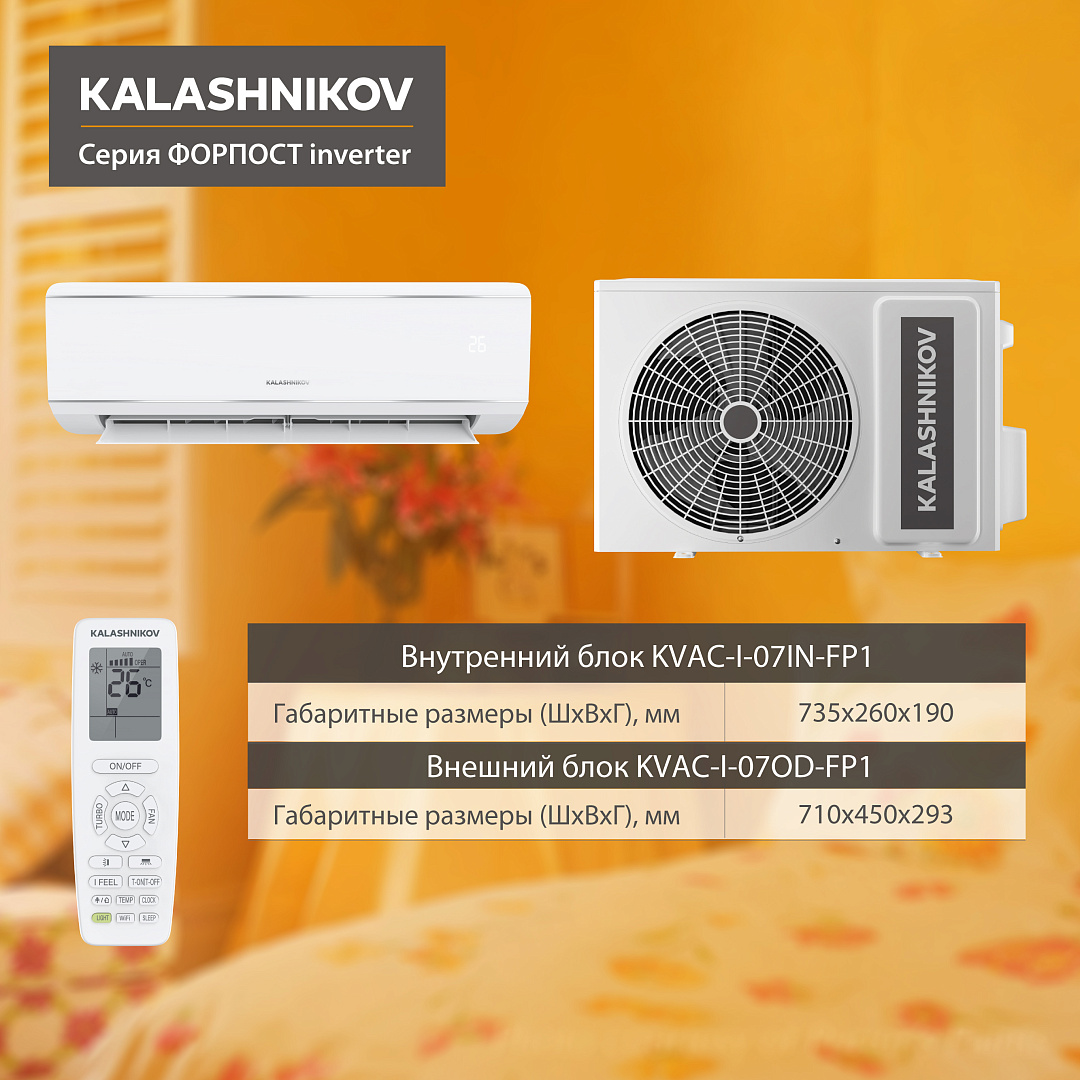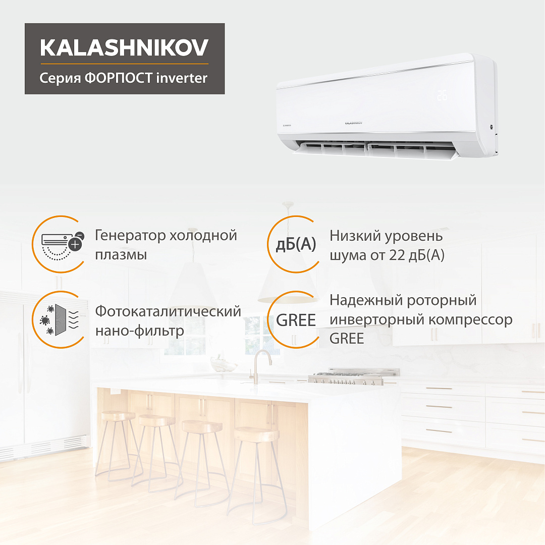 Кондиционер инверторного типа KALASHNIKOV Форпост inverter KVAC-I-07IN-FP1 / KVAC-I-07OD-FP1 — это практичное и надежное климатическое устройство, предназначенное для помещений до 20 м².