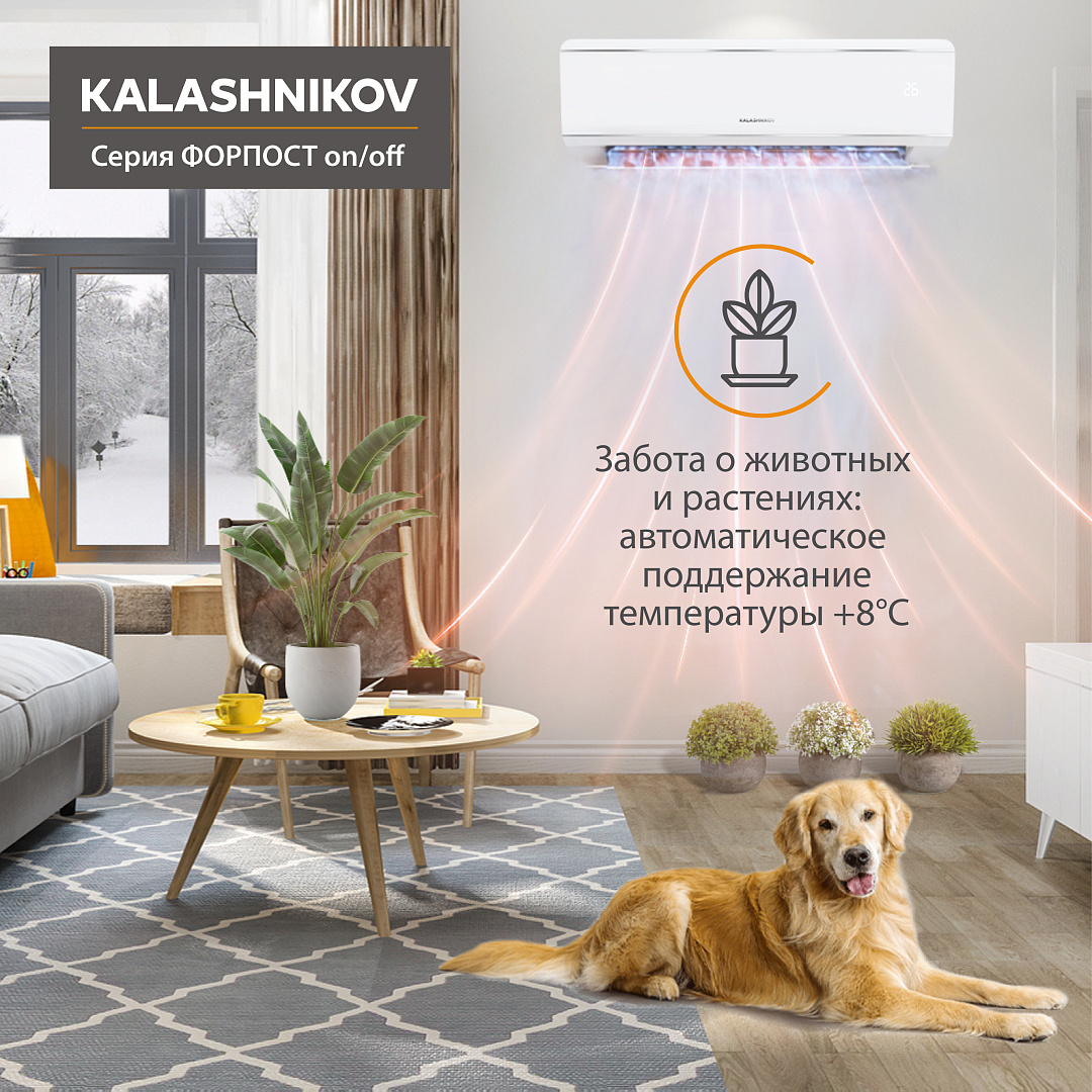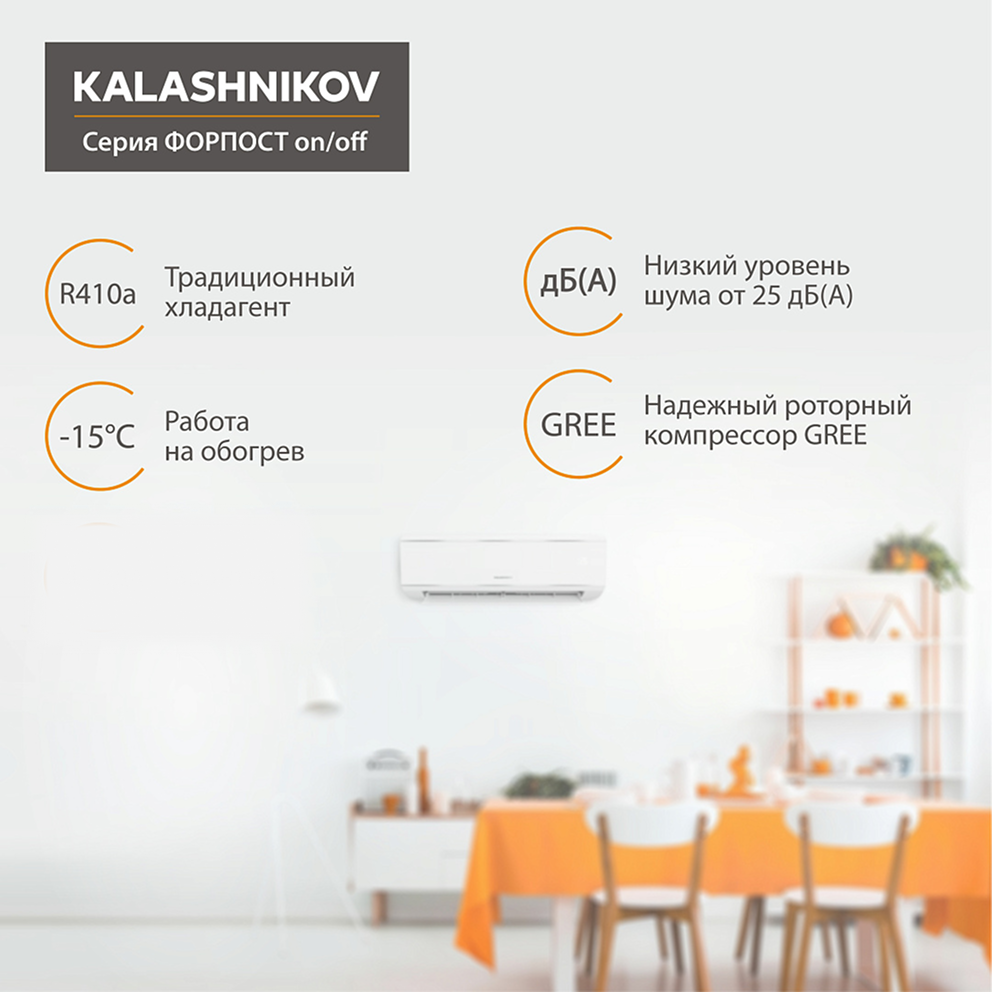 Кондиционер on/off KALASHNIKOV Форпост KVAC-07IN-FP1 / KVAC-07OD-FP1 – это практичный и надежный вариант для охлаждения и обогрева помещений до 20 м². Если вы ищете простое, доступное и эффективное решение, эта модель станет отличным выбором. Узнайте подробности и закажите кондиционер у официальных представителей KALASHNIKOV или на специализированных площадках климатического оборудования.